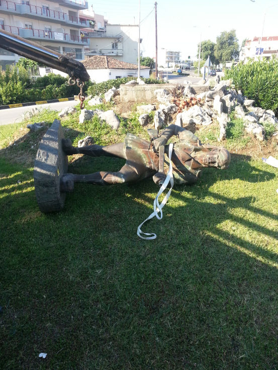 Αμέσως μετά την ενημέρωση, υπάλληλοι της αρμόδιας υπηρεσίας του Δήμου, κινητοποιήθηκαν και σε συνεργασία με την Αστυνομία, μετέφεραν το άγαλμα σε χώρο ασφαλούς φύλαξης του Δήμου. Το άγαλμα έχει υποστεί, ευτυχώς μικρές φθορές, από την πτώση του στο γκαζόν και αφού επισκευαστεί και συντηρηθεί από ειδικό συνεργείο, θα επανατοποθετηθεί στο σημείο που έστεκε τα τελευταία 46 χρόνια.