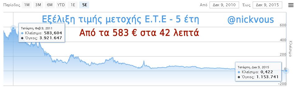 Η καταστροφή της ελληνικής οικονομίας και του τραπεζικού συστήματος σε μια εικόνα: Μετοχή Ε.Τ.Ε. από τα 583 € στα 42 λεπτά σε πέντε χρόνια! Ποιος φταίει;
