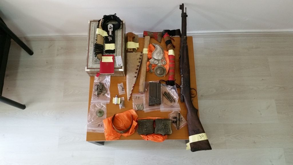 Σε έρευνα στο σπίτι των δραστών, κατασχέθηκαν, μεταξύ άλλων, πλήθος αρχαιολογικών αντικειμένων, τα οποία εμπίπτουν στη Νομοθεσία περί προστασίας αρχαιοτήτων και της εν γένει πολιτιστικής κληρονομιάς καθώς και ένα πολεμικό τυφέκιο και πυρομαχικά.
