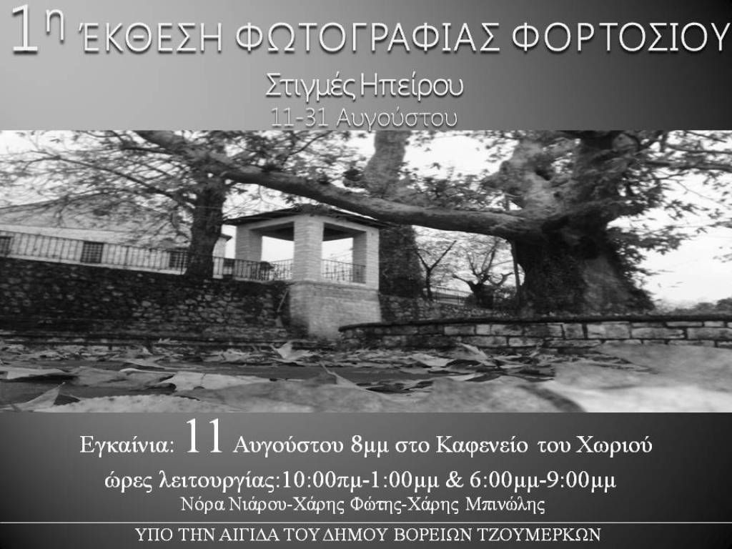 Θέμα της έκθεσης: «Στιγμές Ηπείρου». Τα εγκαίνια θα πραγματοποιηθούν την Πέμπτη 11 Αυγούστου 2016, στις 8 το βράδυ, στο Καφενείο του Φορτοσίου.