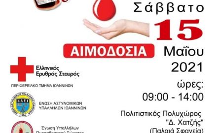 Η Ένωση Αστυνομικών Υπαλλήλων Ιωαννίνων συμμετέχει και στηρίζει την εθελοντική αιμοδοσία που διοργανώνει ο Ελληνικός Ερυθρός Σταυρός – Περιφερειακό Τμήμα Ιωαννίνων σε συνεργασία και με άλλα σωματεία – φορείς του τόπου. Η αιμοδοσία θα διεξαχθεί το Σάββατο 15 Μαΐου 2021 κ...