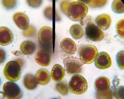 Ακολούθησε η μικροσκοπική παρατήρηση των δειγμάτων και παρατηρήθηκαν στην επιφανειακή αυτή μάζα να βρίσκονται εγκλεισμένα ένα πλήθος μικροφυκών και κυανοβακτηρίων. Ωστόσο, κυρίαρχο είδος είναι το χλωροφύκος.
