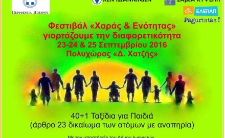 Η Περιφέρεια Ηπείρου και η Χ.Ε.Ν. Ιωαννίνων σε συνεργασία με τον Σύλλογο ΑμεΑ Κυψέλη , την ΕΛΕΠΑΠ Ιωαννίνων και τους Paguristas διοργανώνουν τριήμερο πολιτιστικό φεστιβάλ Χαράς και Ενότητας στα Γιάννενα . Στις 23 , 24 και 25 Σεπτεμβρίου γιορτάζουμε τη διαφορετικότ...